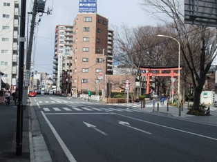 先に進むと、氷川神社への参道と市街とに分かれる道となります。